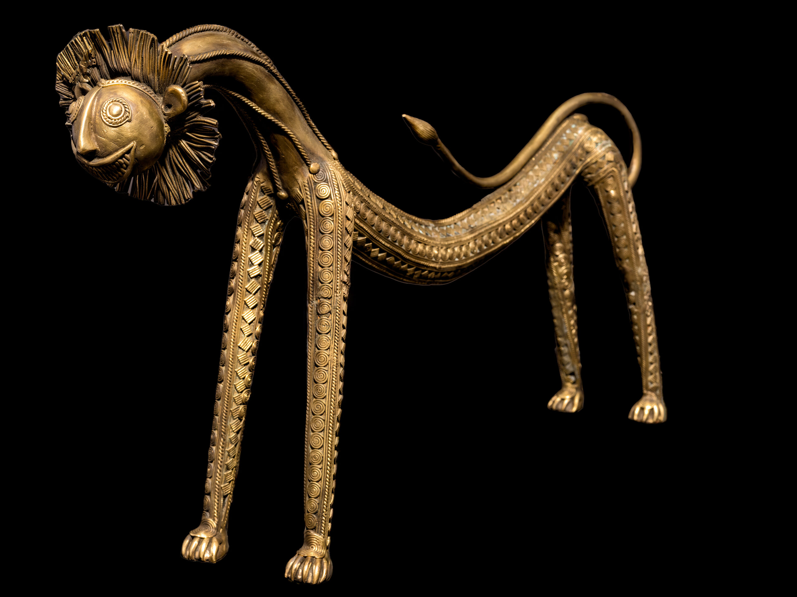 This stylised lion, rendered in warm, polished gold tones, features intricate hand-worked detailing along its elongated legs and textured mane. The expressive face enhances its charm and character, while the overall form strikes a balance between playfulness and sophistication. Standing between ritual artefact and contemporary sculpture, the work makes a distinctive statement, bringing visual warmth that combines heritage craftsmanship with a modern aesthetic sensibility.